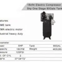 - Electric compressor 5 hp one stage 80 gals tank 18cfm Certified with Warranty